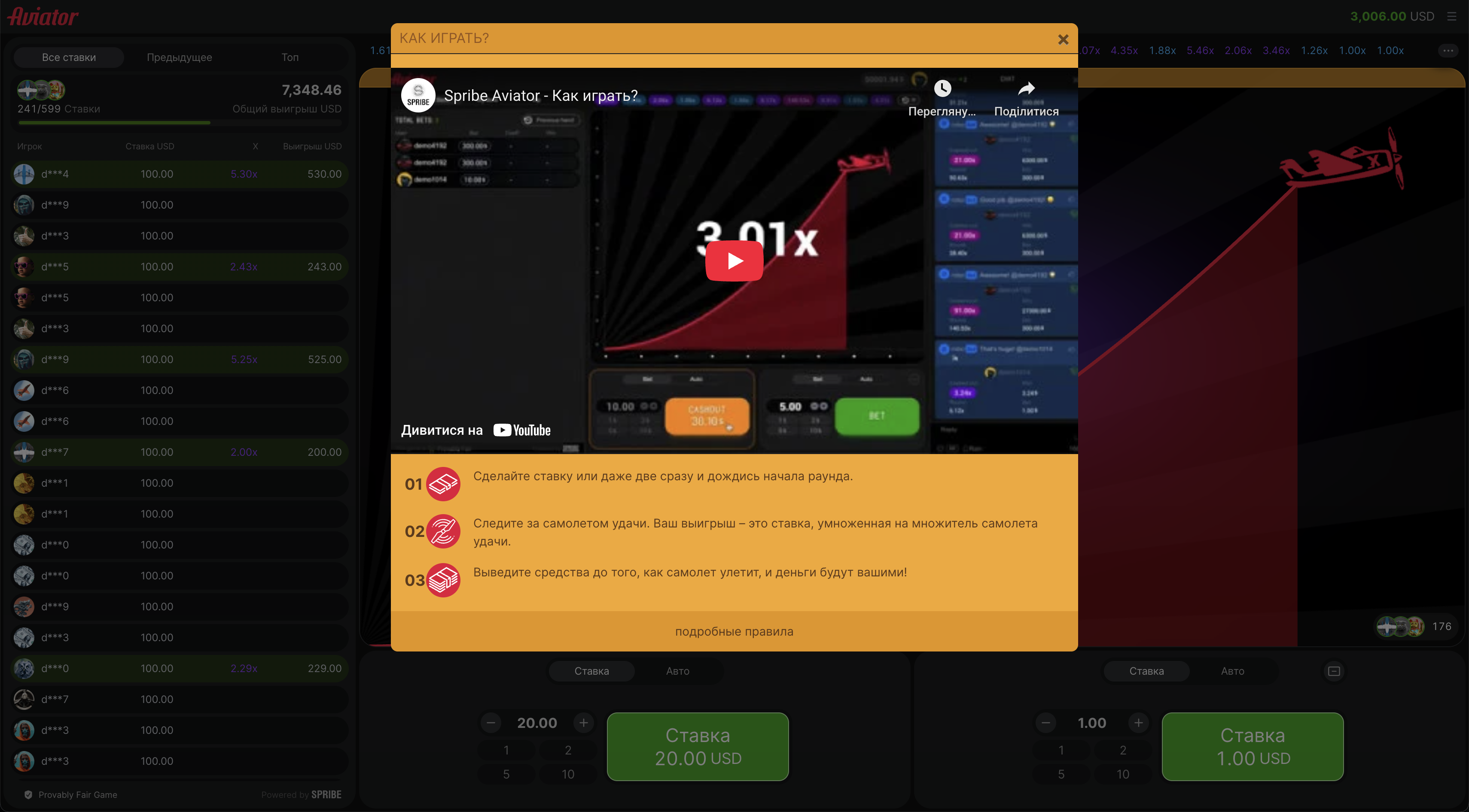 Pin Up предлагает Aviator с минимальной ставкой от 0.1 доллара до 100 долларов. На сайте есть демо-режим с виртуальными монетами для бесплатной игры. Интерфейс показывает список игроков в реальном времени слева, где видны все ставки и выигрыши других участников - можно учиться на чужих стратегиях. В центре экрана график траектории самолета, вверху отображаются текущие коэффициенты. Pin Up работает по лицензии и гарантирует честность через технологию Provably Fair.